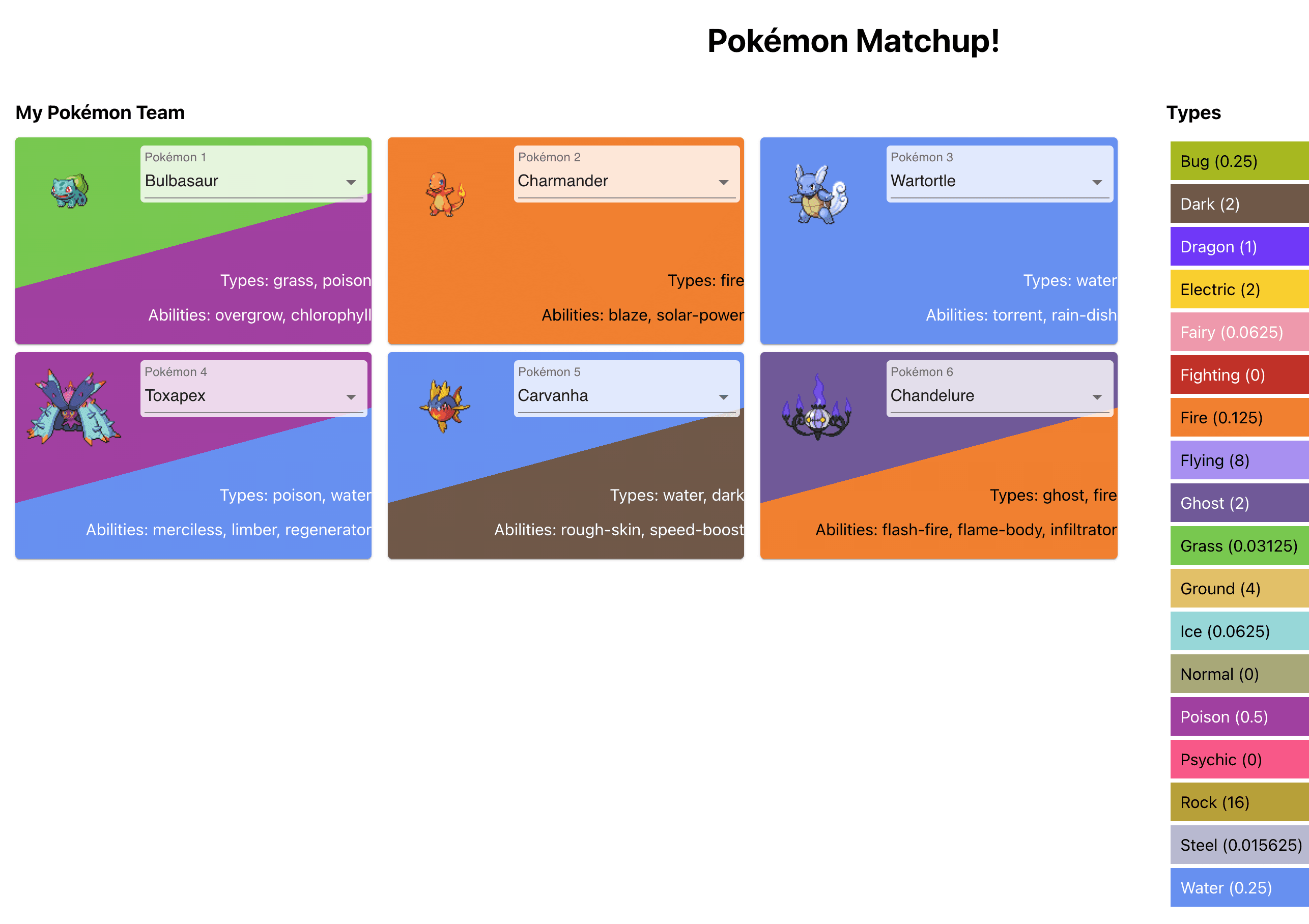 A tool for create the perfect Pokémon team. Pick your Pokémon and see how their types match up and complement each other.