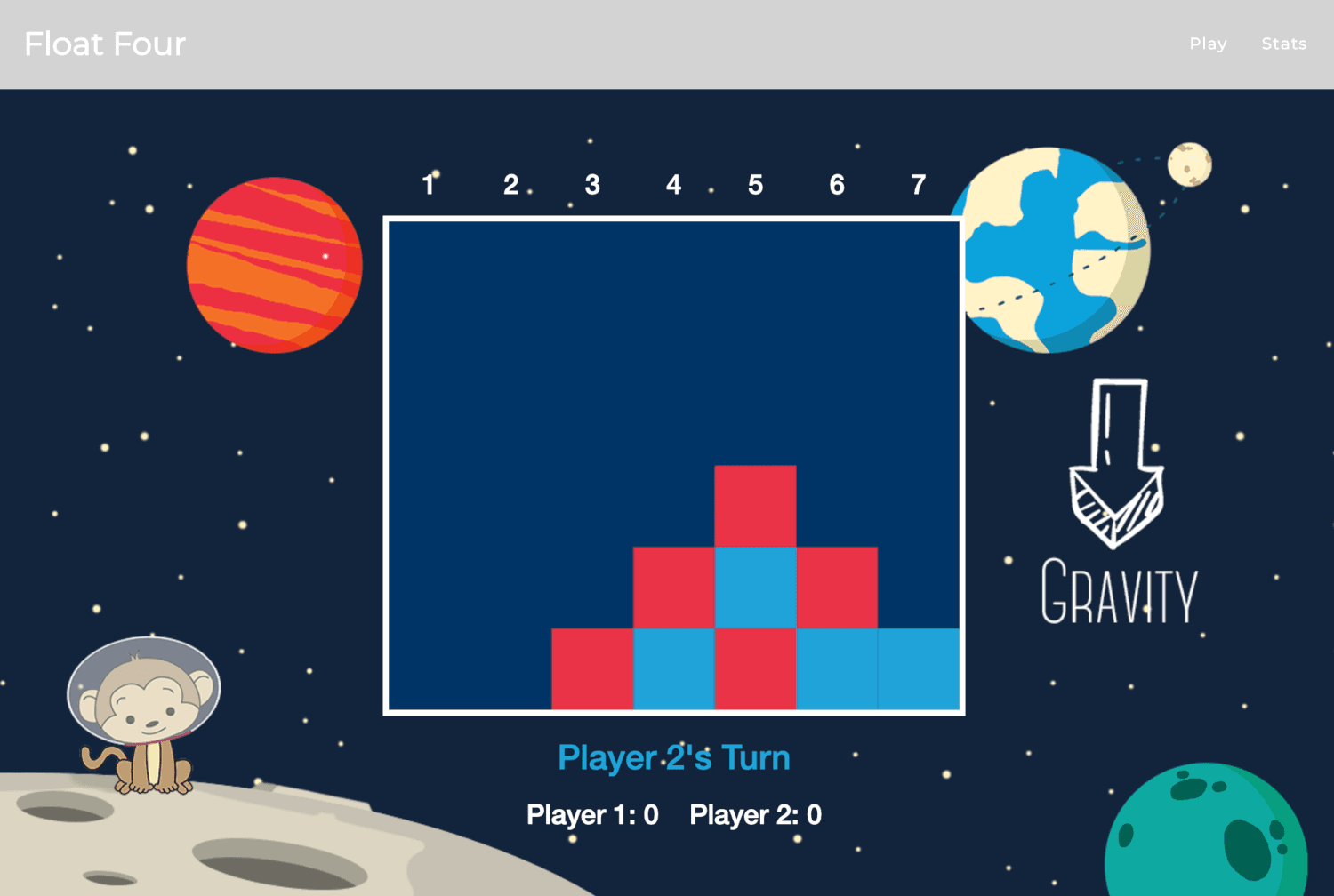 A web application for a new variation of Connect Four. Float Four is adds a new dimension of strategy to the classic game Connect Four. Players can, at their will, reverse the direction of gravity, causing the pieces to float to the top of the board and therefore altering the relationships between them.